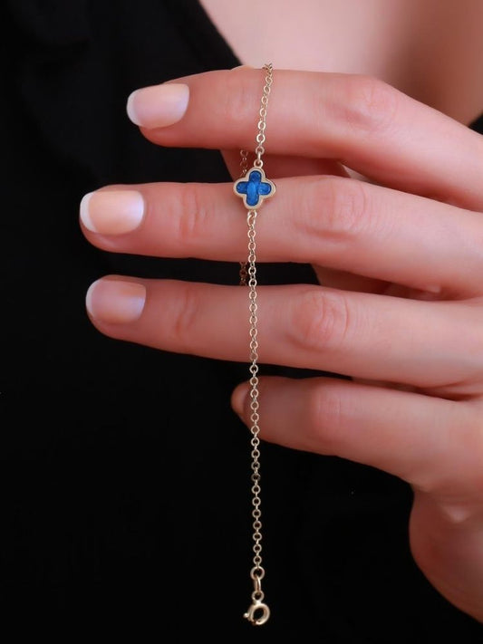 Kleeblatt Armband Gold 585 : 14 Karat Gold Blau emailliertes Kleeblatt - Armband