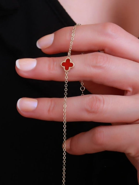 Kleeblatt Armband Gold 585 : Echt 14 Karat Gold Rot emailliertes Kleeblatt - Armband