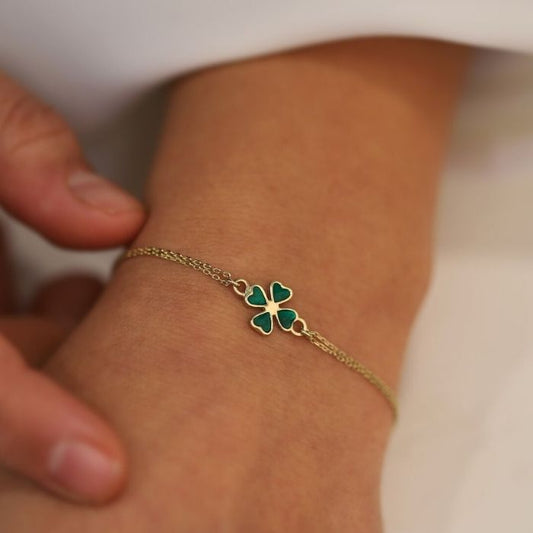 Kleeblatt Armband Gold 585 : 14 Karat Gold Grün emailliertes Kleeblatt - Armband