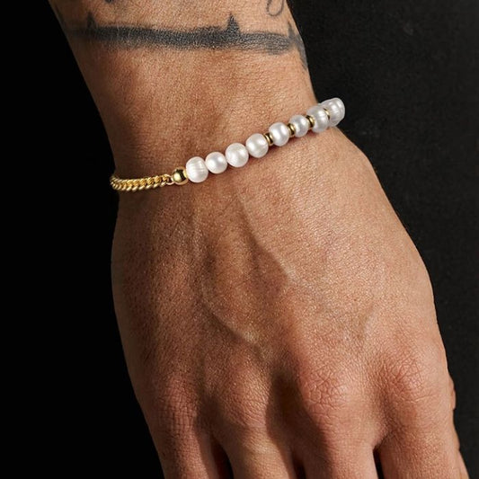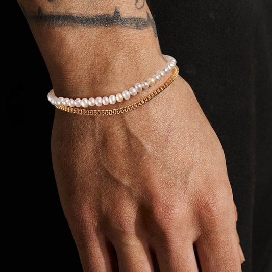 Silberarmband Herren Damen : 925 Sterling Silber Doppellagige Kubanische Kette mit Barock Perlen Armband